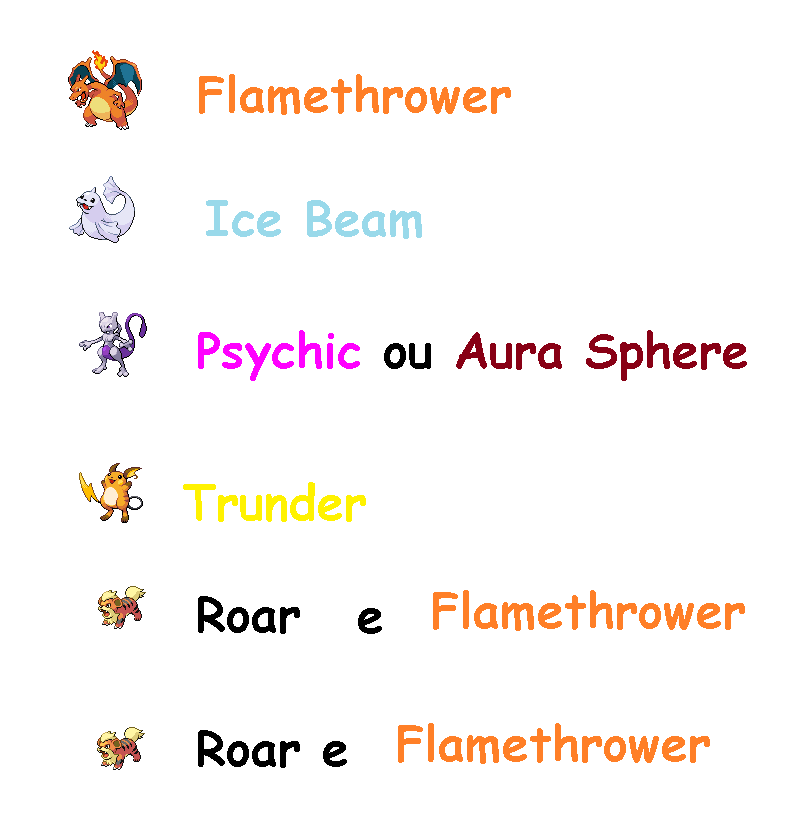 - você precisa de um 2 pokemons com surf, 3 pokemons com discarge, e 1 com solar beam.