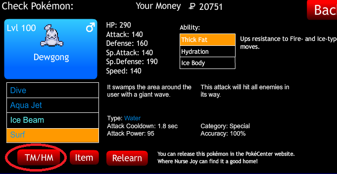 vá em um pokemon aquatico, e clique em TM/HM