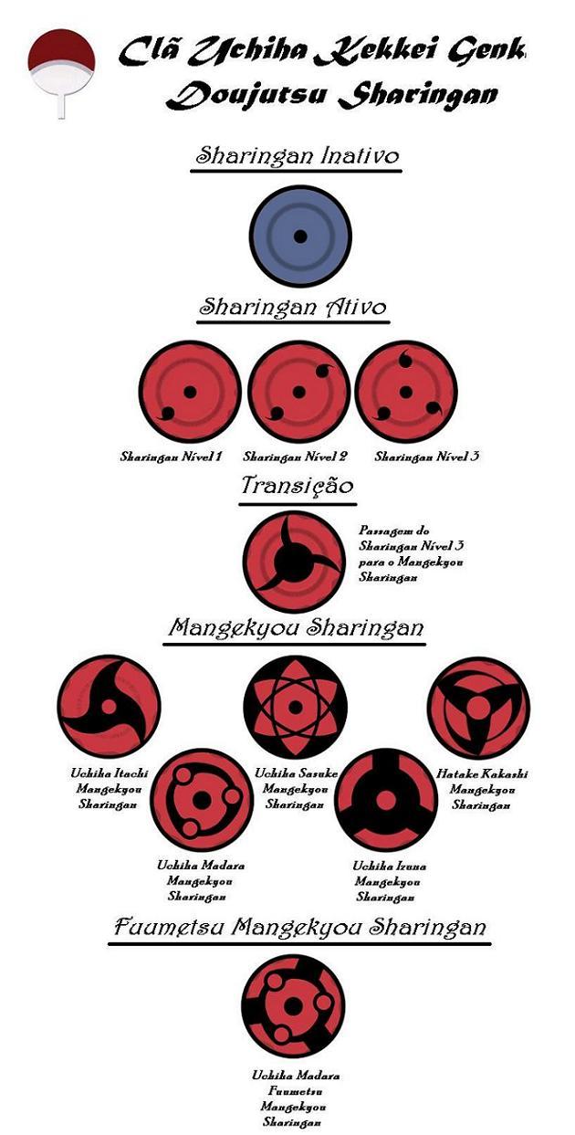 Essa é a forma mais forte do Sharingan, o Mangekyou Sharingan. Para se chegar nessa forma avançada é necessário que se mate o melhor amigo. Não se sabe a explicação para esse método, mas é o único que parece funcionar. {spoiler}Não se sabe o porquê, mas Hatake Kakashi conseguiu um Mangekyou Sharingan sem, aparentemente, matar seu melhor amigo. O dele era muito diferente ao usado pelo Uchiha Itachi, o outro ninja que tem este Sharingan poderoso.{spoiler} Segundo Itachi, existem outros dois usuários desse estágio, apesar deles nunca terem sido citados novamente, nem para dizer se estão vivos ou mortos. Esse estágio permite a utilização de três técnicas especiais:
